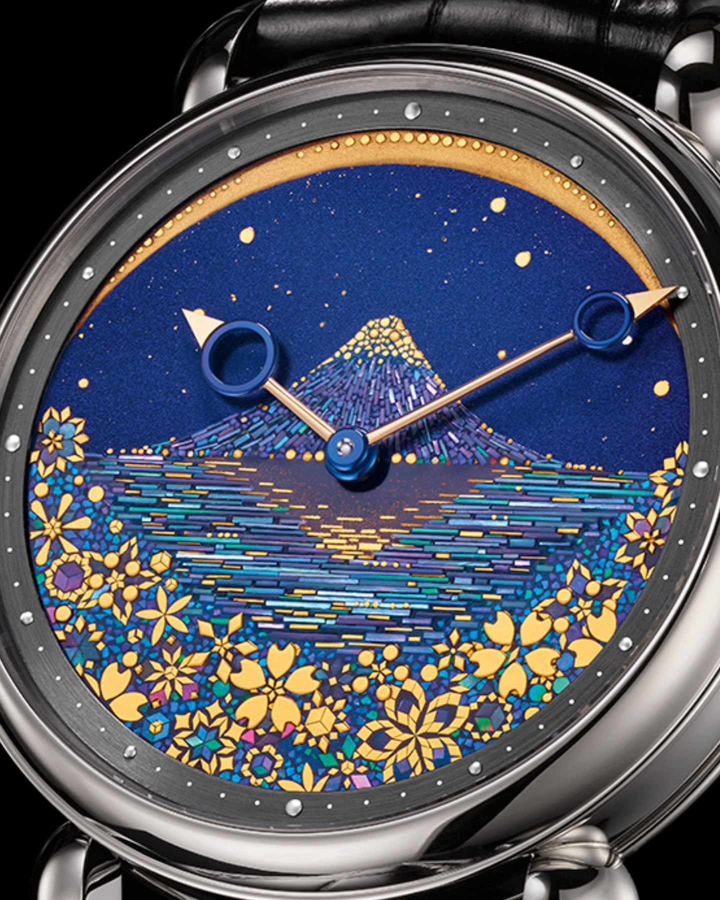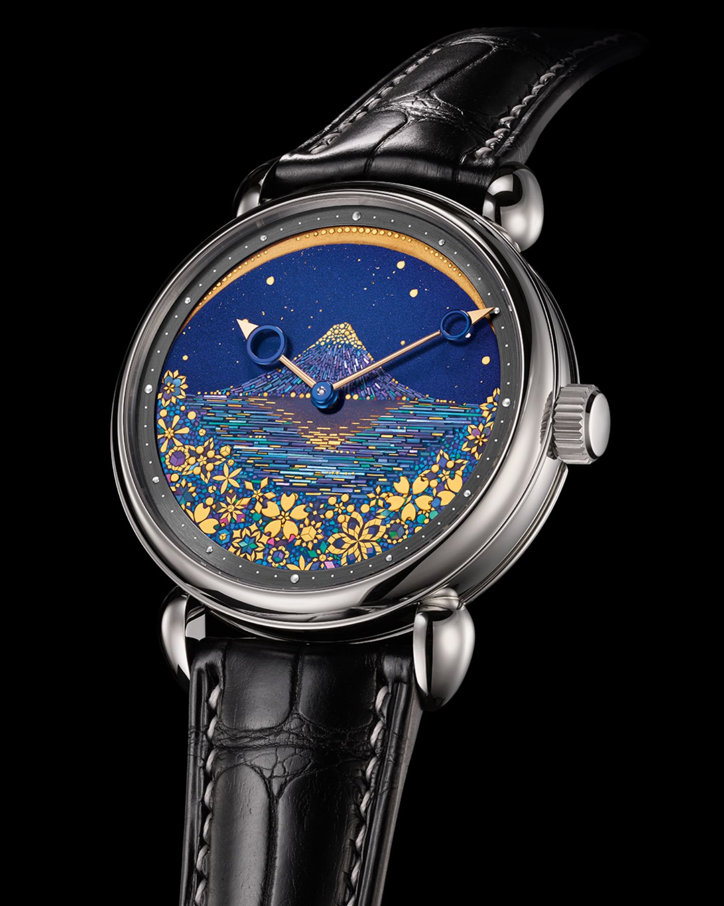 - Cadran : pièce d’art unique créée par le légendaire atelier japonais de laque Kitamura, représentant le mont Fuji