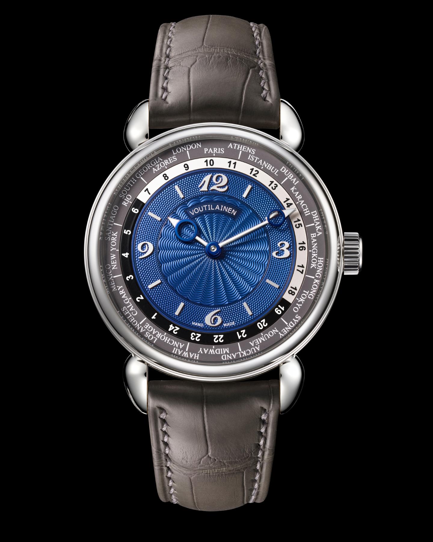 Hours, minutes and worldtime complication with towns and peripheral 24-hour disc with day/night indication. Quick crown correction.